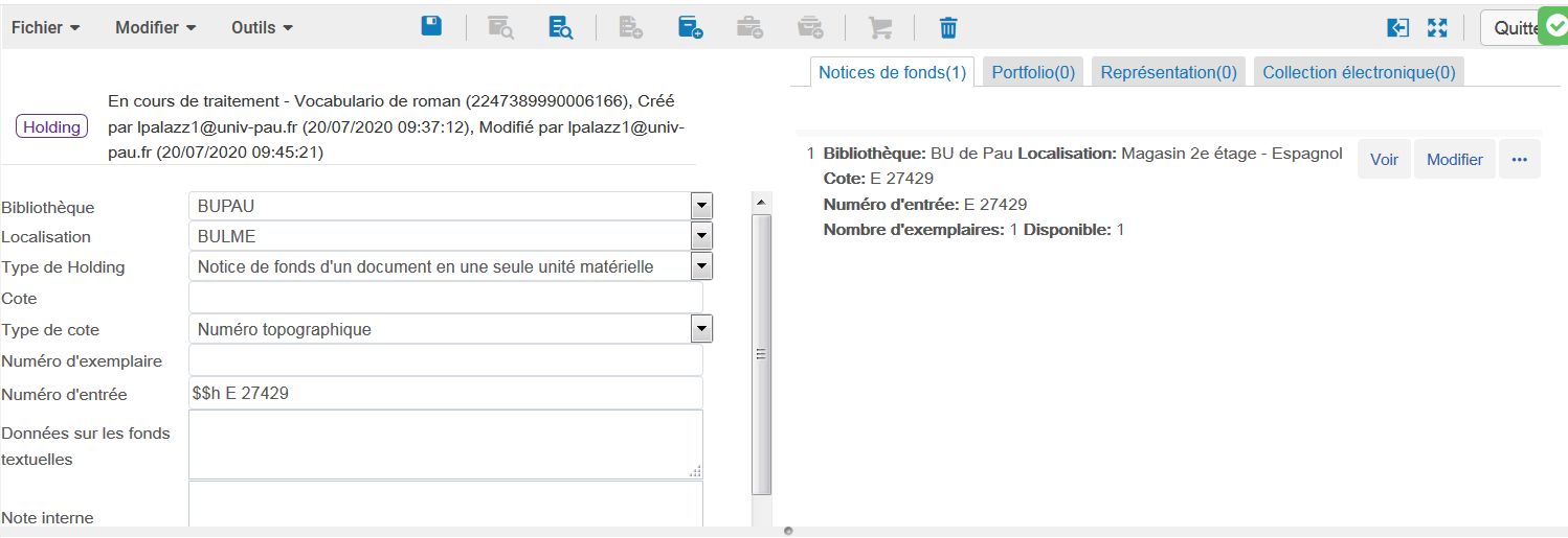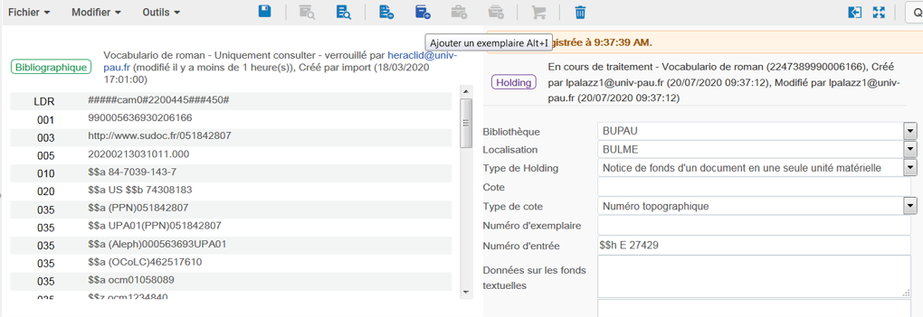 La holding et l’exemplaire ont été créés, ne pas oublier de « Quitter » et de répondre « non » au brouillon et « oui » pour débloquer la notice