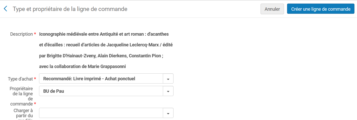 4/ Dans « Type d’achat » mettre LIVRE IMPRIME – ACHAT PONCTUEL et dans propriétaire de la LC, mettre sa bibliothèque puis cliquez sur « Créer une ligne de commande »