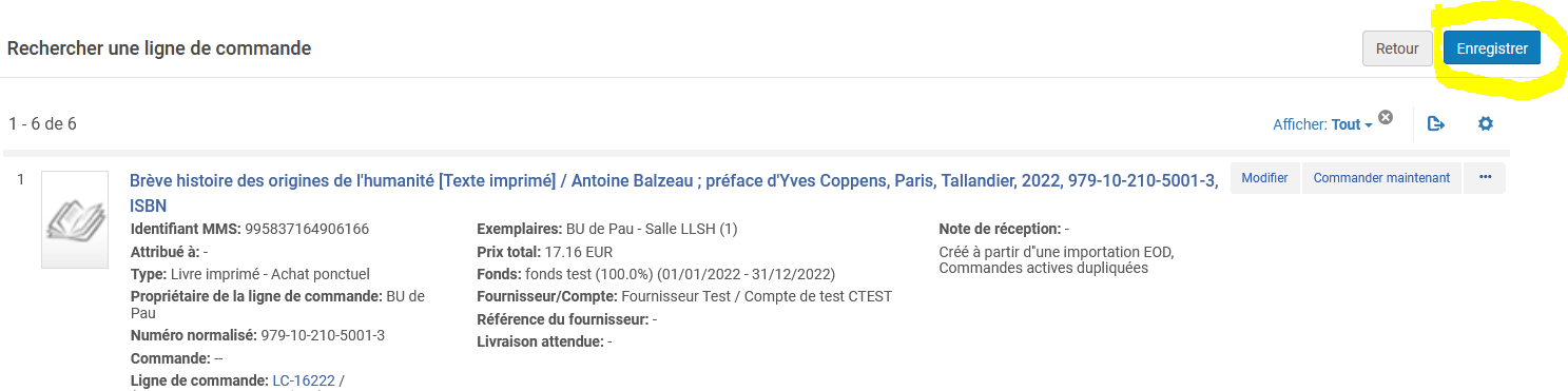 Je clique sur le bouton bleu ‘Enregistrer’ pour créer un jeu de résultats avec les lignes de commande concernées :