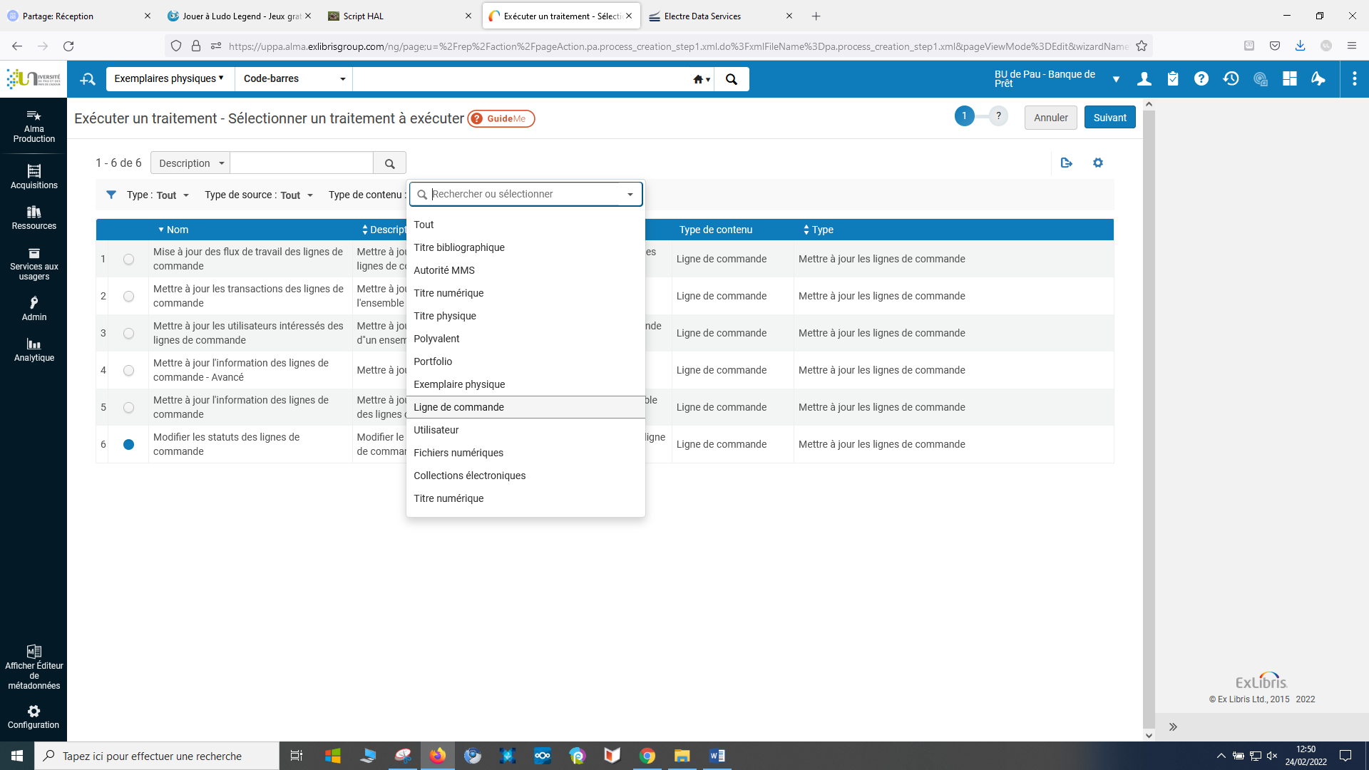 Dans le ‘Type de contenu’ je choisis ‘Ligne de commande’ pour ne voir que les traitements appropriés. Je sélectionne ‘Modifier les statuts des lignes de commande’