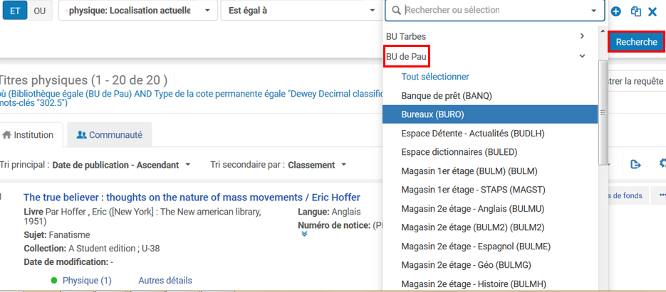 - Choisir la bibliothèque et la localisation désirée, puis, cliquez sur Recherche