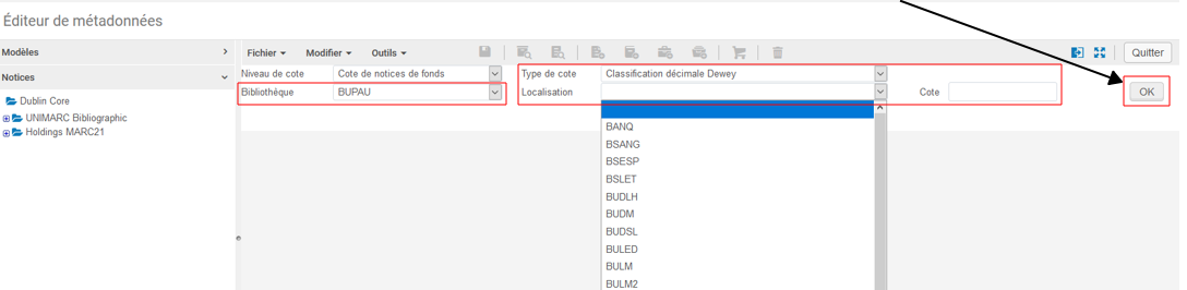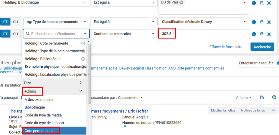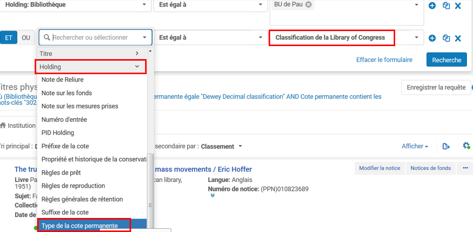 - Dans le 2ème formulaire, dans Holding, chercher Type de la cote permanente, attention c’est la LC qui est par défaut, choisir Dewey ou autre système pour la CDU par exemple, ajouter un 3ème formulaire