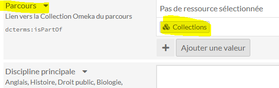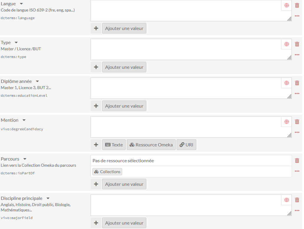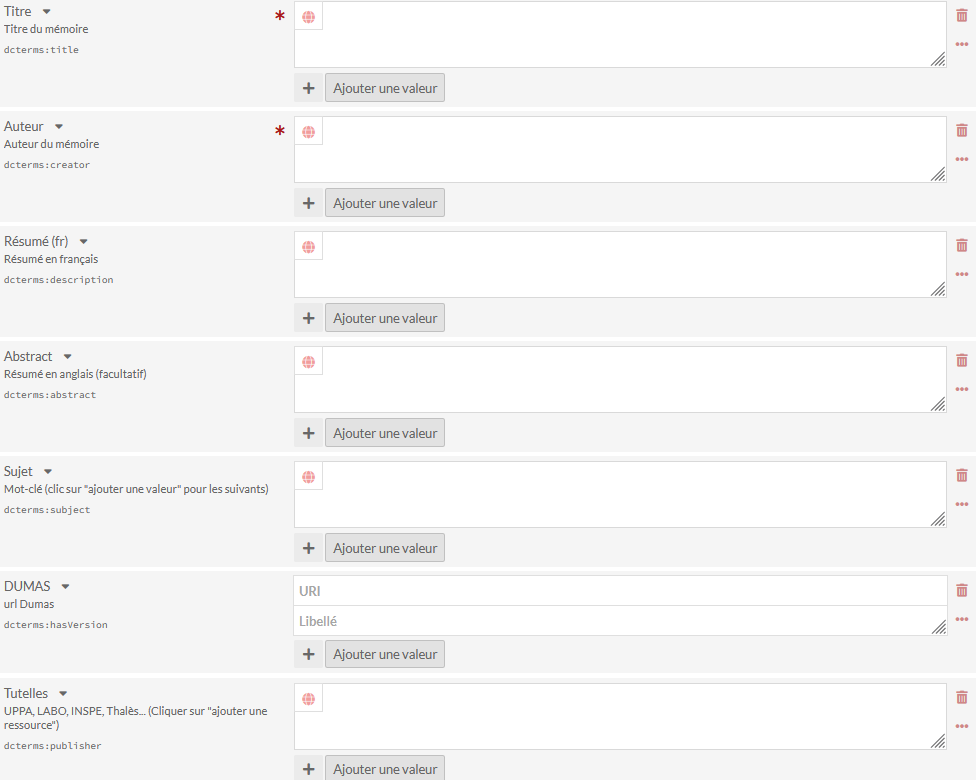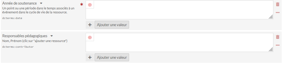 Les noms de l’auteur et du responsable pédagogique doivent s’écrire dans l’ordre Nom, Prénom avec une majuscule en début de nom et en début de prénom. Ne mettre qu’un nom par champ, et cliquer sur ajouter une valeur pour chaque nouveau nom.