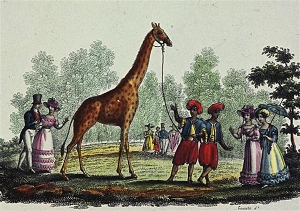 À l’été de 1827, à Paris, l’enthousiasme exotique est à son comble : peu avant l’arrivée des Osages, le vice-roi égyptien Méhémet Ali avait fait cadeau à Charles X d’une girafe, nommée Zarafa, dont le trajet de Marseille à Paris fit sensation et qui devint une attraction majeure dans la capitale, où des milliers de curieux – dont, peut-être, les Osages – vinrent la voir au Jardin du roi (l’actuel Jardin des plantes). Le célèbre naturaliste Étienne Geoffroy Saint-Hilaire, qui avait accompagné la girafe dans son périple, avoua sans ambages que les Osages étaient les principaux concurrents de Zarafa. Car tout Paris voulait aussi voir les «Indiens», qui furent montrés de partout. Pour leur faire comprendre la grandeur de la France, on les conduisit notamment au département des antiquités du Louvre, dont la section égyptienne avait été créée en 1826 par Champollion en personne, qui en était le directeur. Pour celui-ci, la rencontre de ces Osages dans un décor classicisant et leur absence de réaction face aux chefs-d’œuvre de l’art antique exposés avaient «quelque chose d’affligeant», et il ajoute : «L’orgueil de la civilisation nous commande de dire que tout le tort était du côté des Osages.» (Jean-François Champollion, Lettres à Zelmire, Paris, L’Asiathèque, 1978, p. 92).
